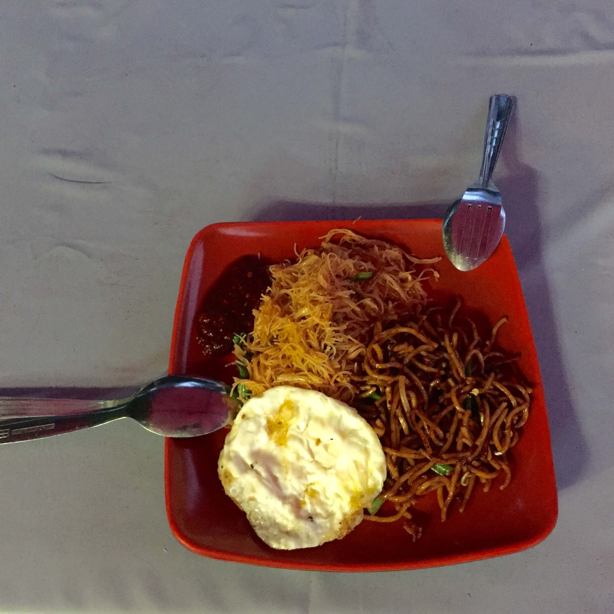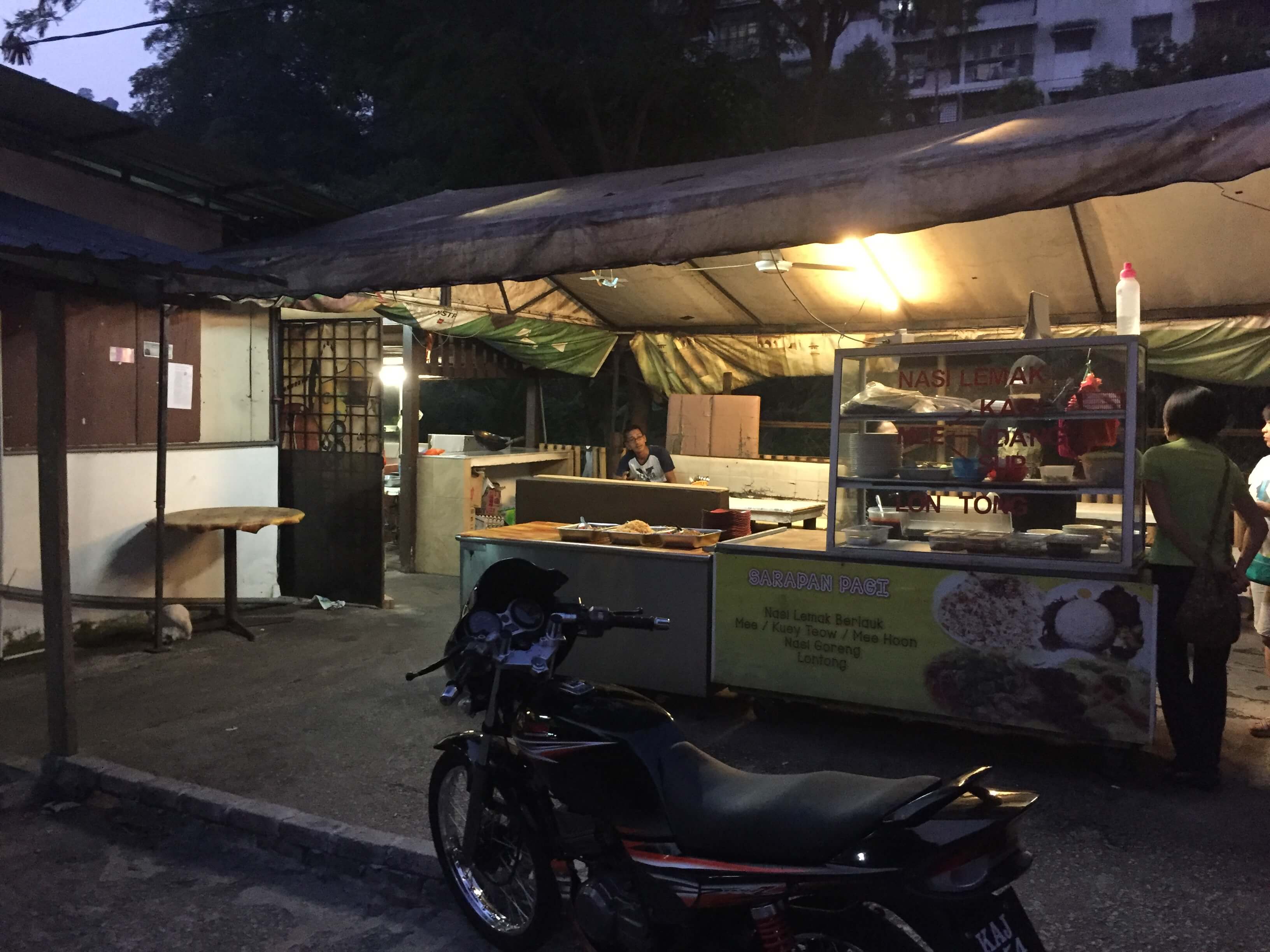 At 7am, a stall owner was just setting up his stall. Nasi lemak, fried noodles and lontong beckoned to us.