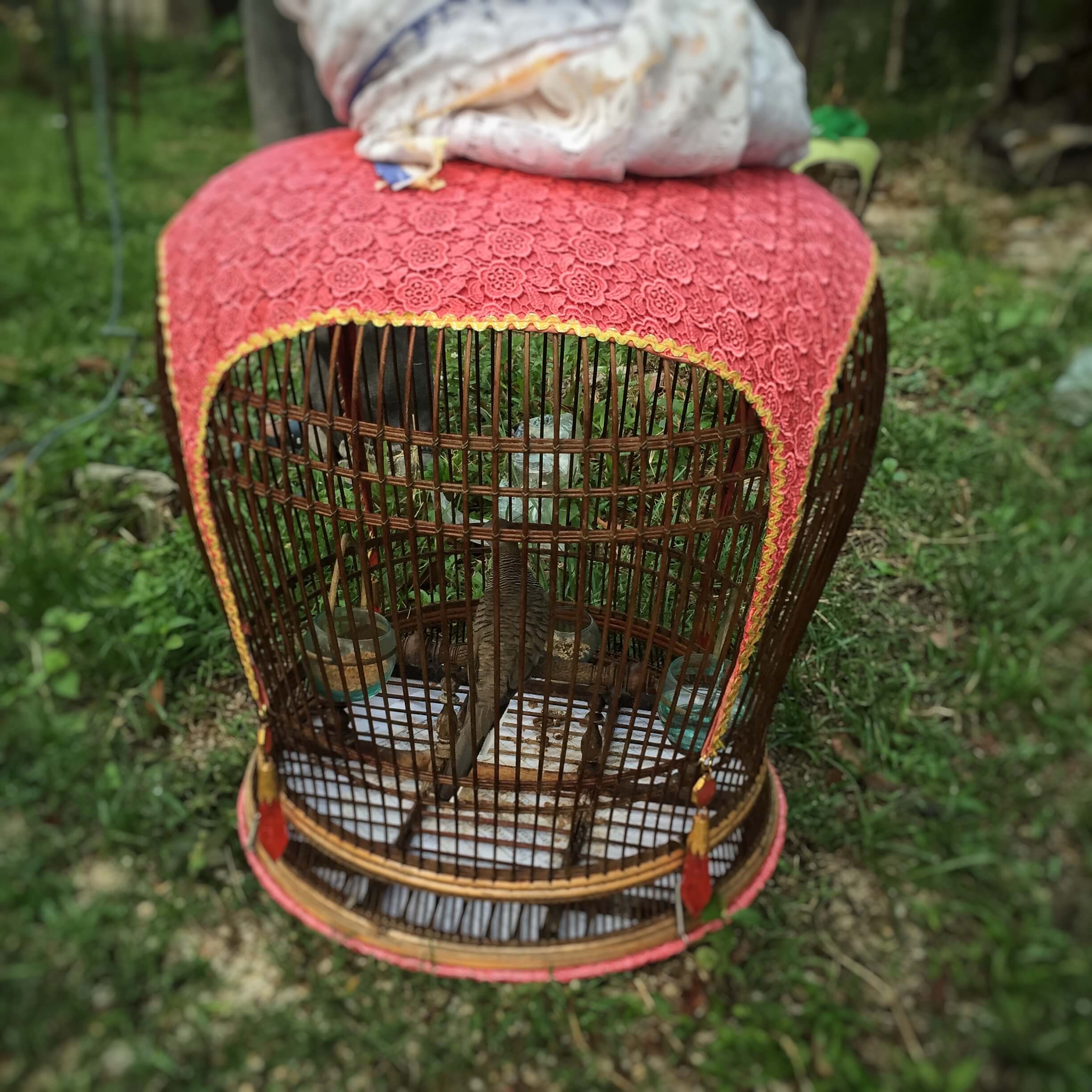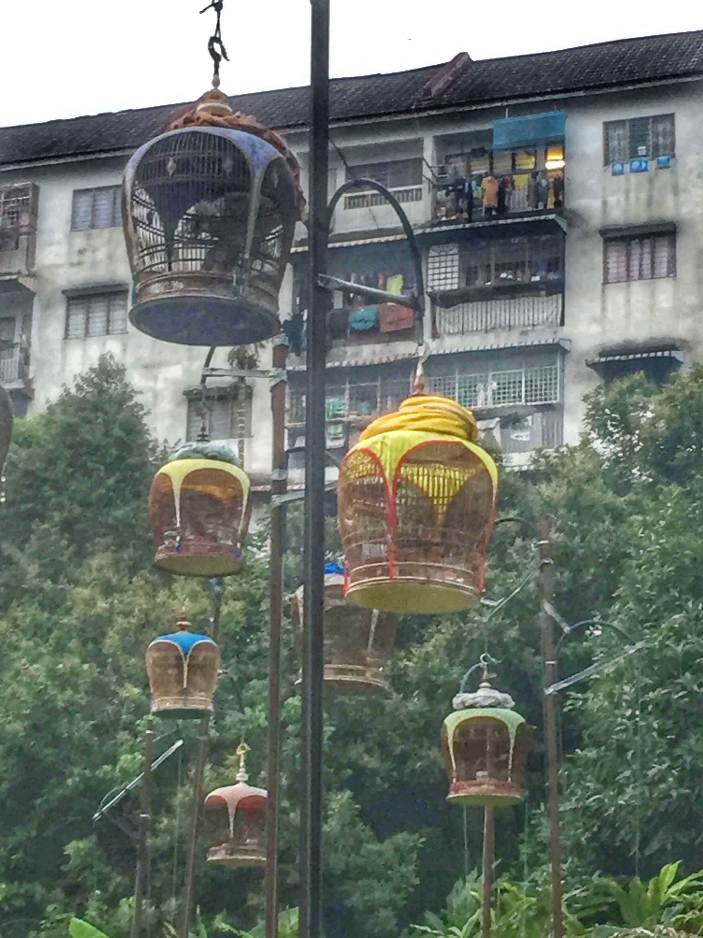 Just next to the stall, there were many poles with hanging bird cages.