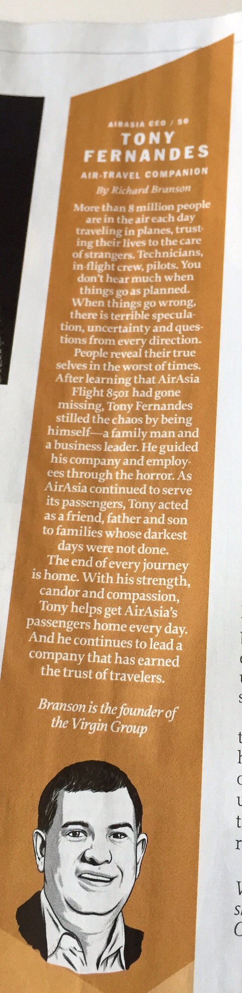 He was recently named one of Time magazine’s 100 most influential people. The entry on him, written by Virgin Group founder Richard Branson, says: “People reveal their true selves in the worst of times. After learning that AirAsia Flight 8501 had gone missing, Tony Fernandes stilled the chaos by being himself – a family man and a business leader.”