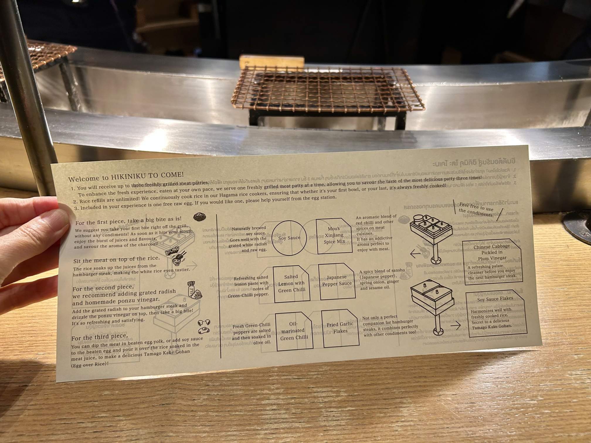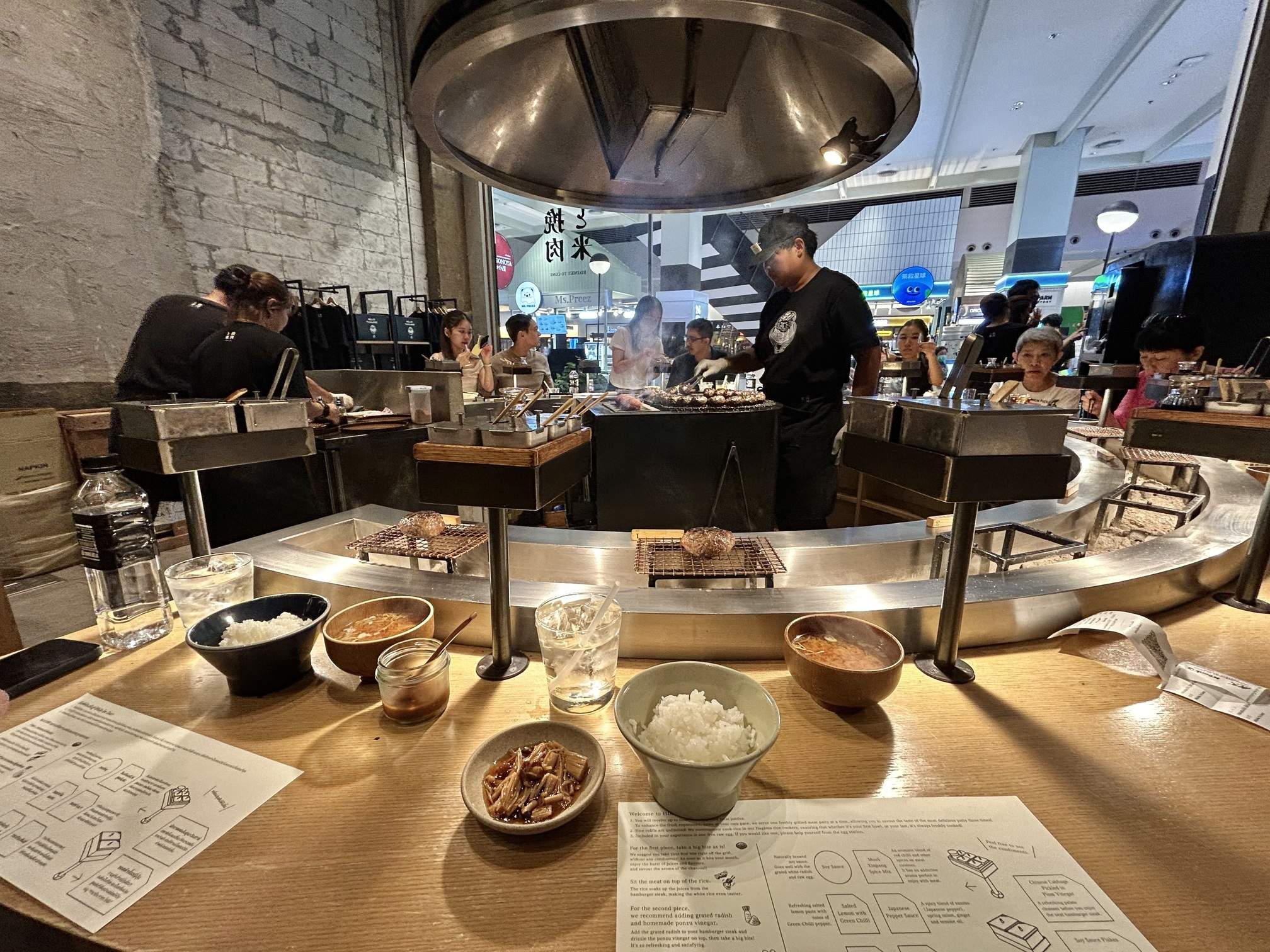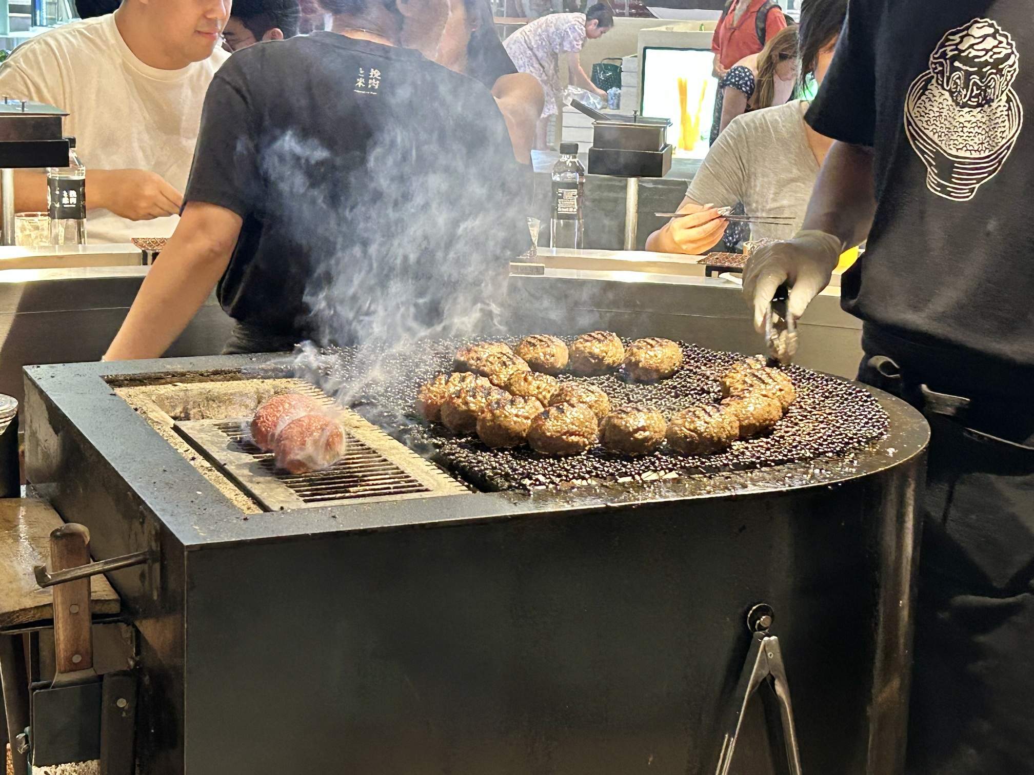 - Just Grilled: Every seat is a “Just grilled premium seat,” placed around an open charcoal counter. The hamburg steaks are grilled over charcoal and served right in front of you—in what feels like just one second! The unique aroma of the charcoal enhances the flavor of the grilled meat. Each piece of the three-piece set is 90 grams, and the chef monitors your eating rhythm to serve each piece individually, ensuring you experience the aroma and flavor of a freshly grilled patty every time.