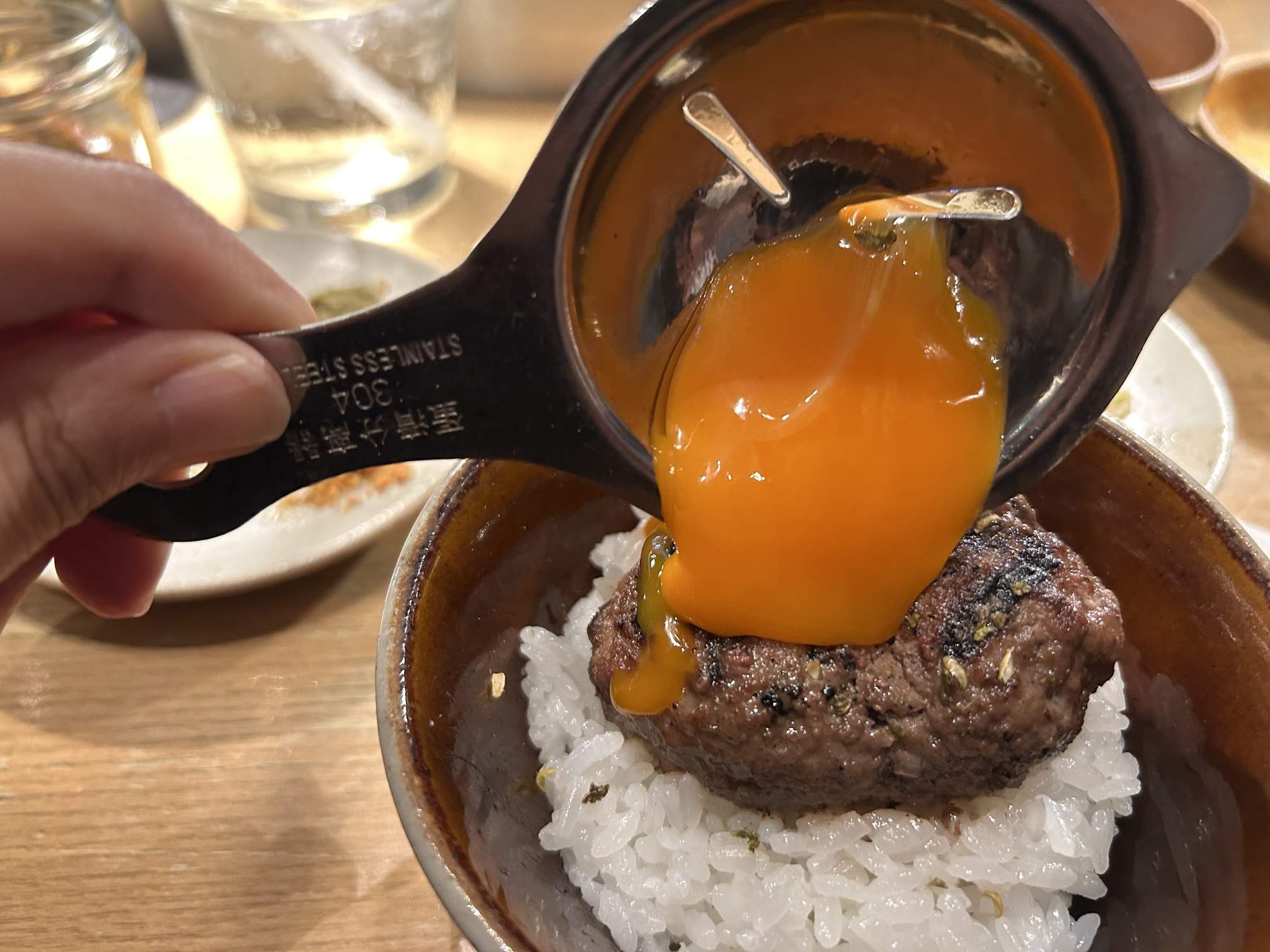 - For the Third Piece: This piece is meant to be eaten with a raw egg yolk. The restaurant gives you a whole egg, and you separate the yolk from the white yourself using a small ladle—a fun and unique touch! I found the whole yolk to be a bit overwhelming and sticky for me, so I’ll probably just dip the hamburg in the yolk next time. The instructions also suggest dipping the meat in beaten egg yolk, or adding soy sauce to the beaten egg and pouring it over the rice to make a delicious Tamago Kake Gohan.