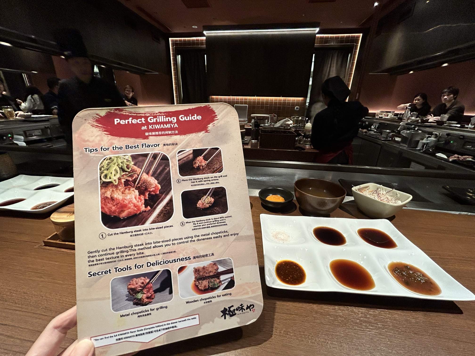 - The Setup: The space features two large counters (roughly 20 seats each) and two group tables. The chefs are spread thin; they juggle weighing, shaping, and searing patties while managing refill requests. I even saw a chef stop to take photos for customers!