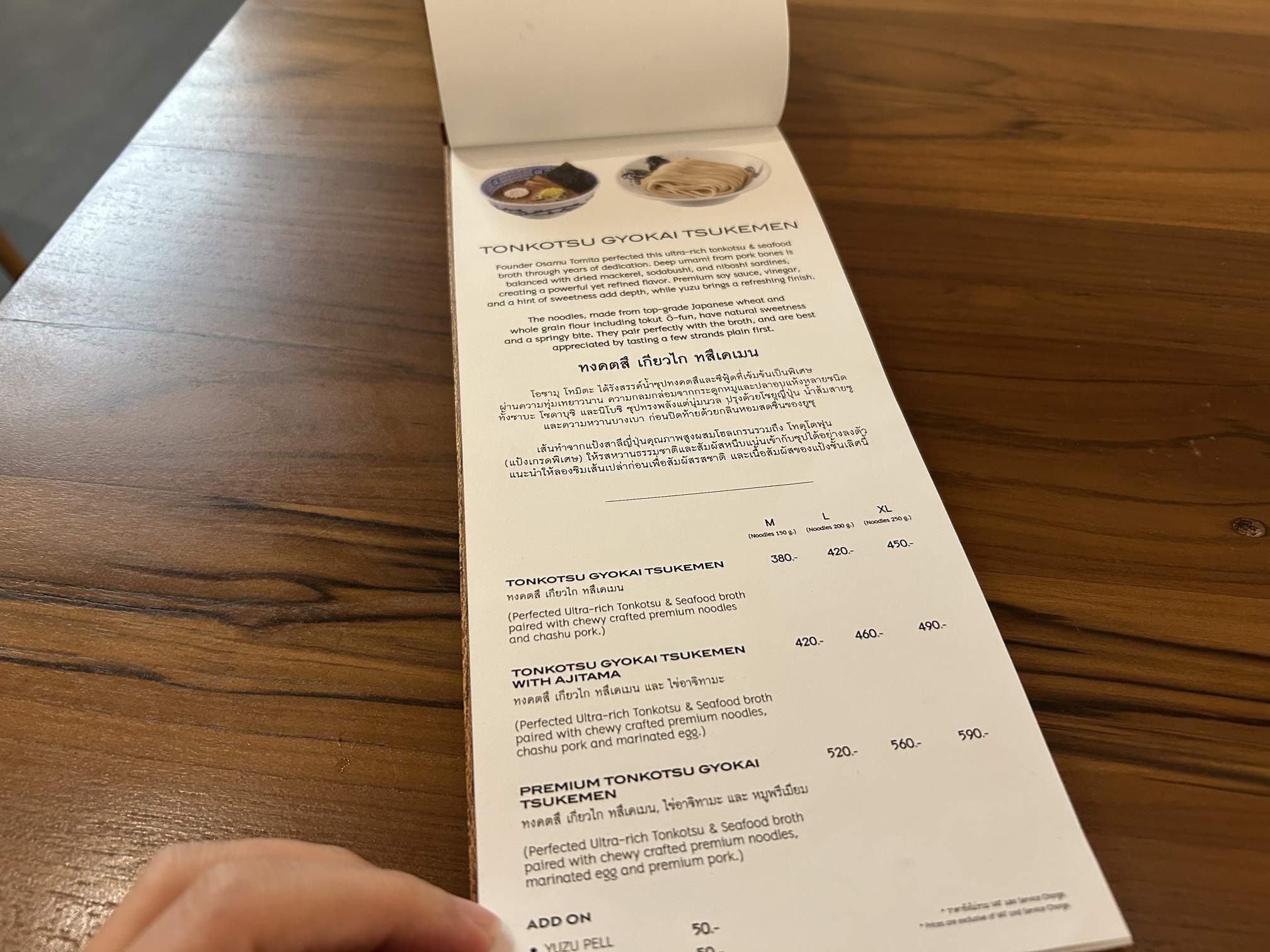 | Tonkotsu Gyokai Tsukemen (w/ Chashu) | M, L, XL | 360 Baht | 420 Baht | 450 Baht |
