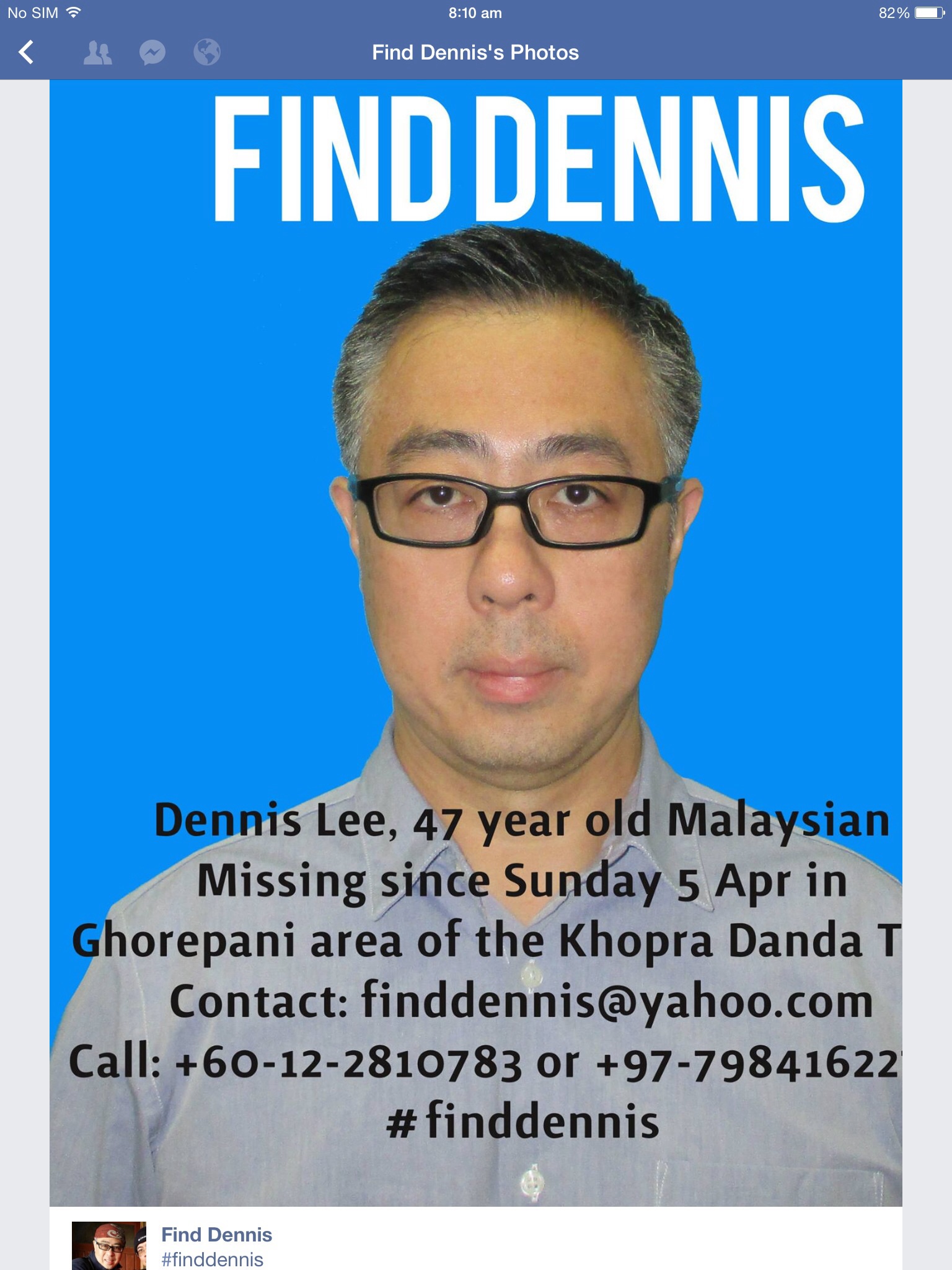 Find Dennis Facebook page has 1,434 likes now. ‘Liking’ for me is a way to keep abreast of the search efforts, and also to show support and hopefully, sending positive vibes to Dennis wherever he is right now. In fact not only to Dennis, but also to his family.