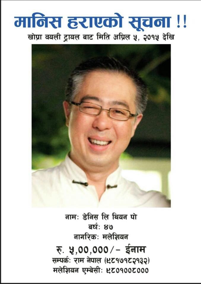 Dennis Lee, a Malaysian businessman has been missing since April 5th 2015 while trekking in Annapura Base Camp, Nepal in the Ghorapani area. The unfortunate incident happened almost three weeks before the Nepal Earthquake.