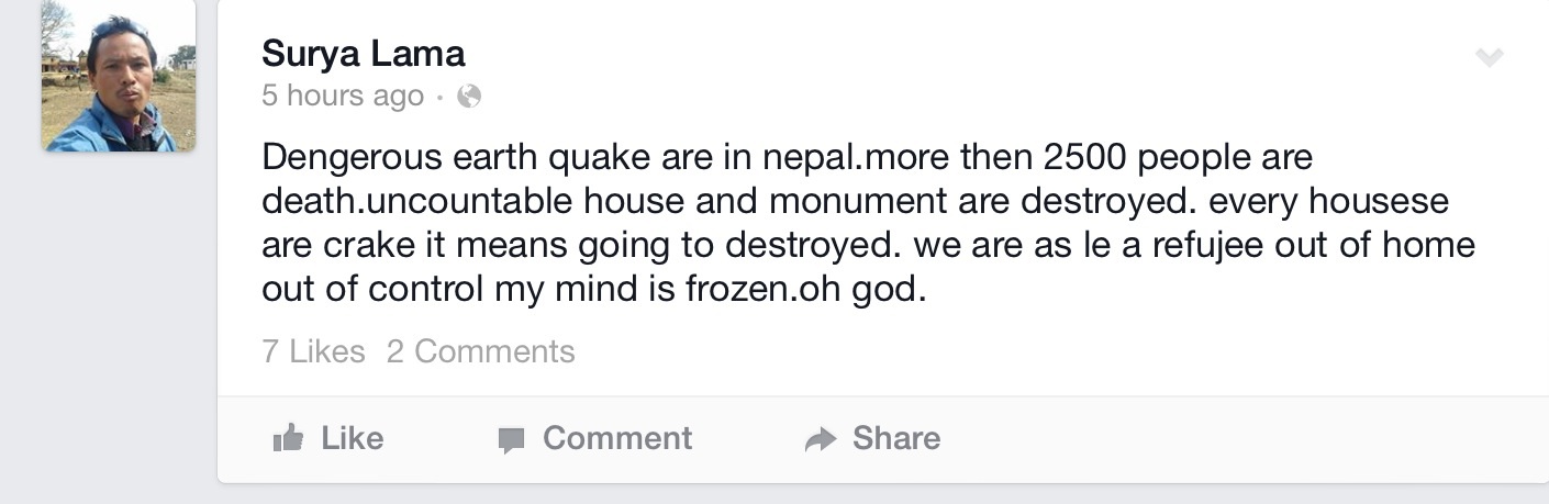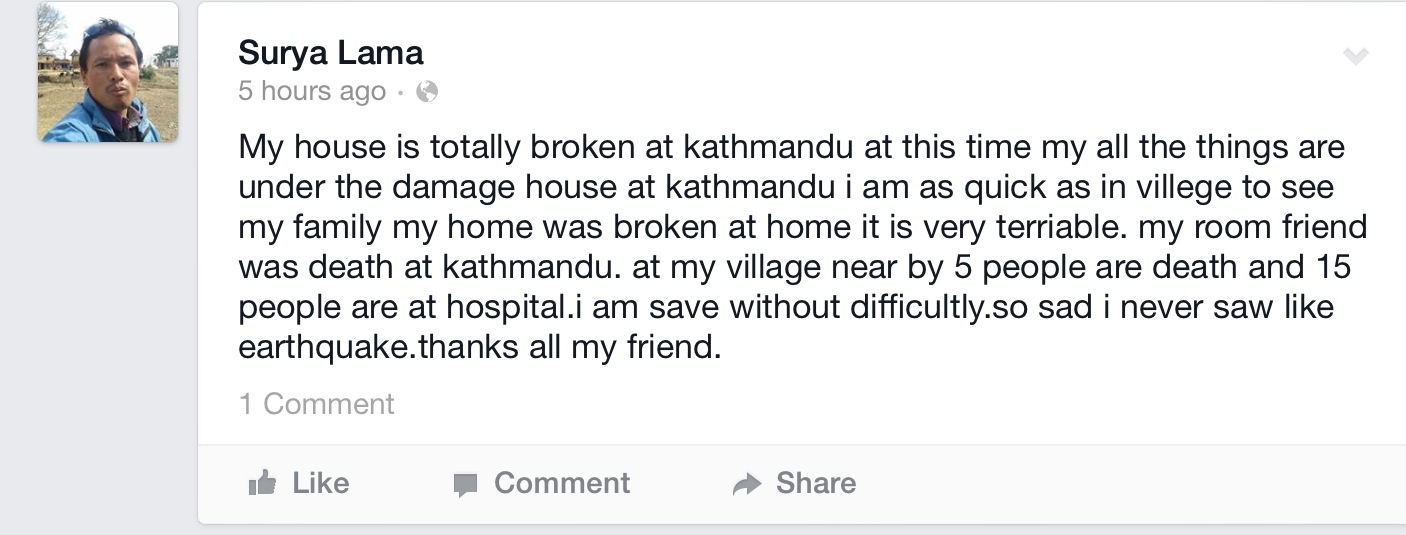 All In Between Surya Lama. Safe but take refugee in the streets. April 27, 2015 Editor #PrayforNepal Share this:Share Share on Facebook (Opens in new window) Facebook Share on X (Opens in new window) X Email a link to a friend (Opens in new window) Email