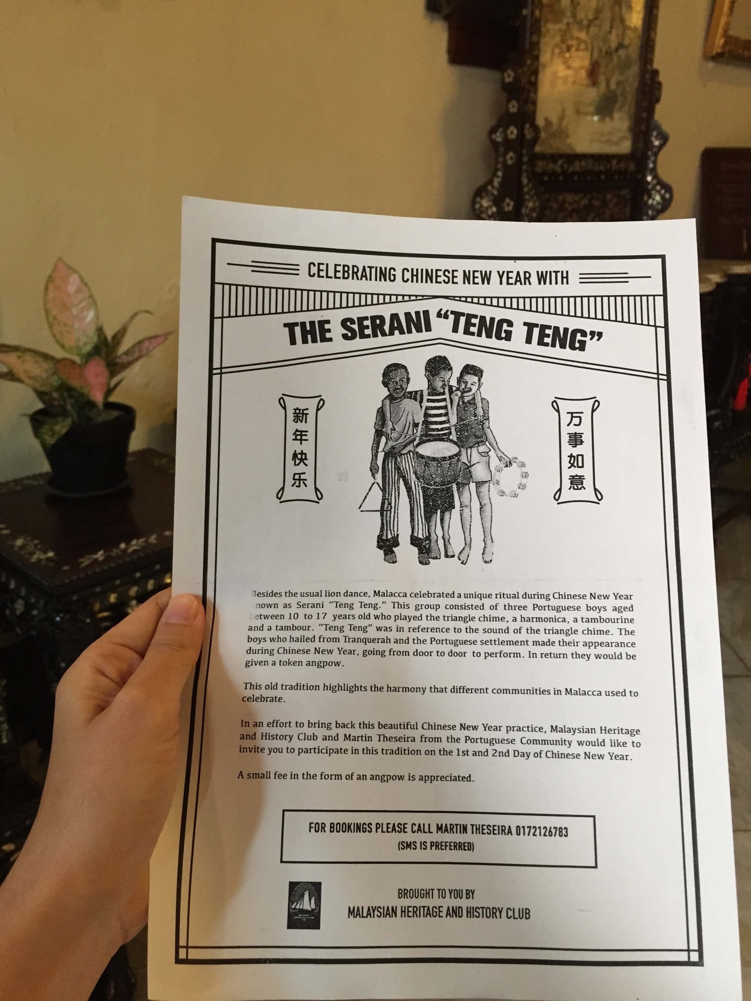 Besides the usual lion dance, Melaka celebrated a unique ritual during Chinese New Year, known as “Serani Teng Teng.” Serani Teng Teng was Serani way of celebrating Chinese New Year.