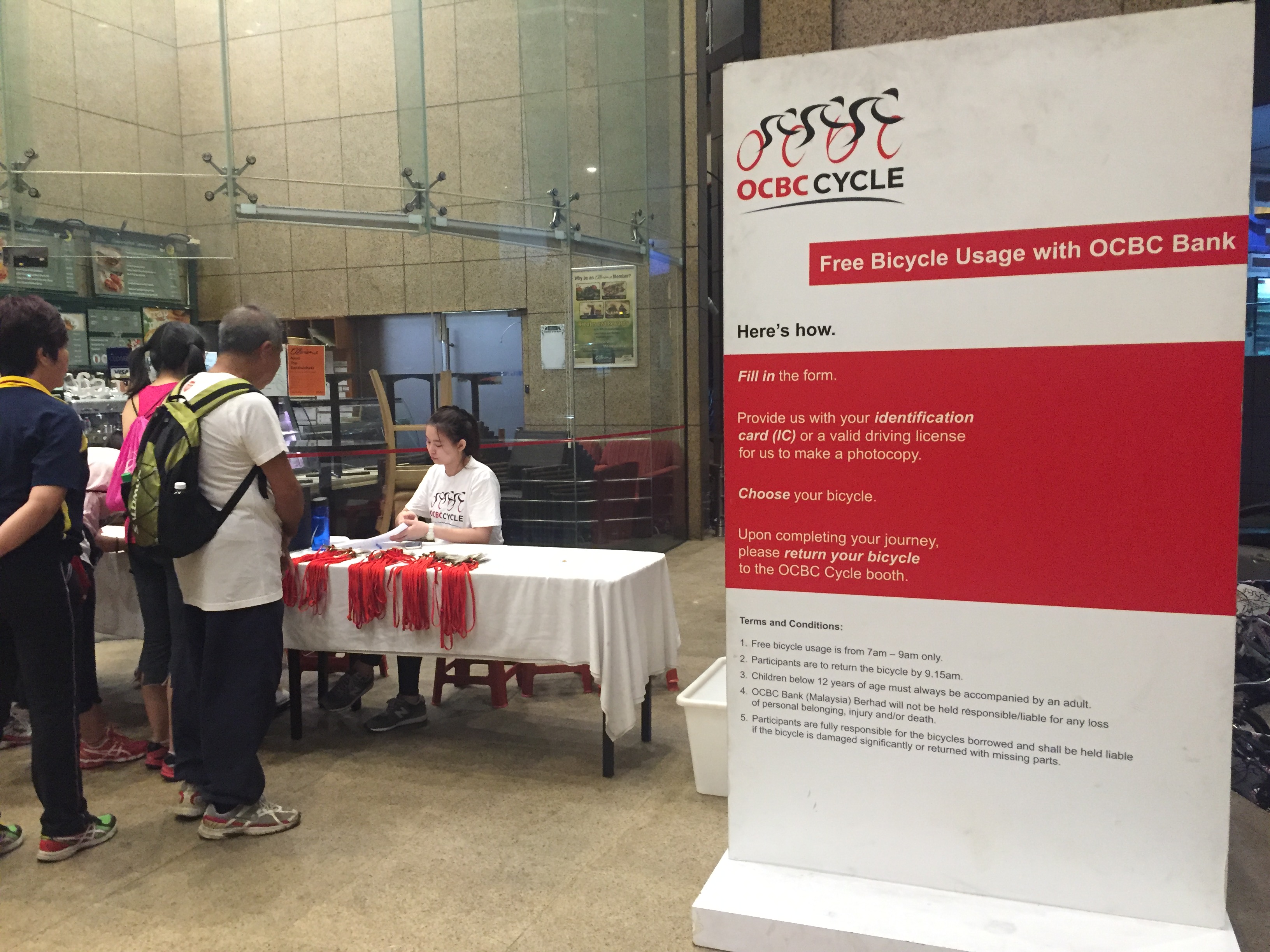From Galeri Kuala Lumpur, we walked towards OCBC Bank (OCBC Cycle booth) at Menara OCBC, Jalan Tun Perak to get our hands on free (100?) bike rental, available on first-come-first-serve basis. Stated on FB from 6.30am onwards, but they were giving out the bikes already when we arrived around 6.15-6.20am. The bank is located adjacent to Masjid Jamek LRT station.