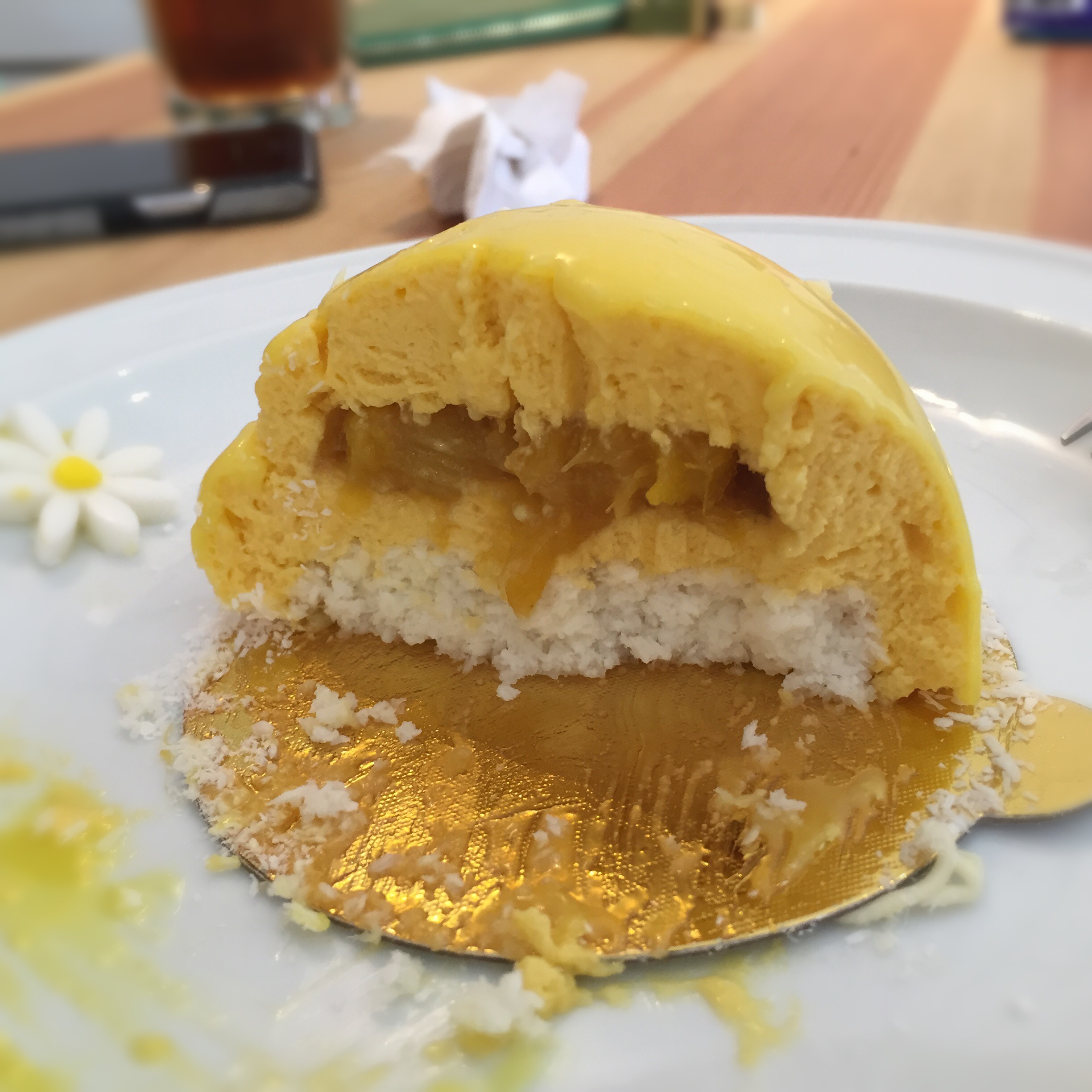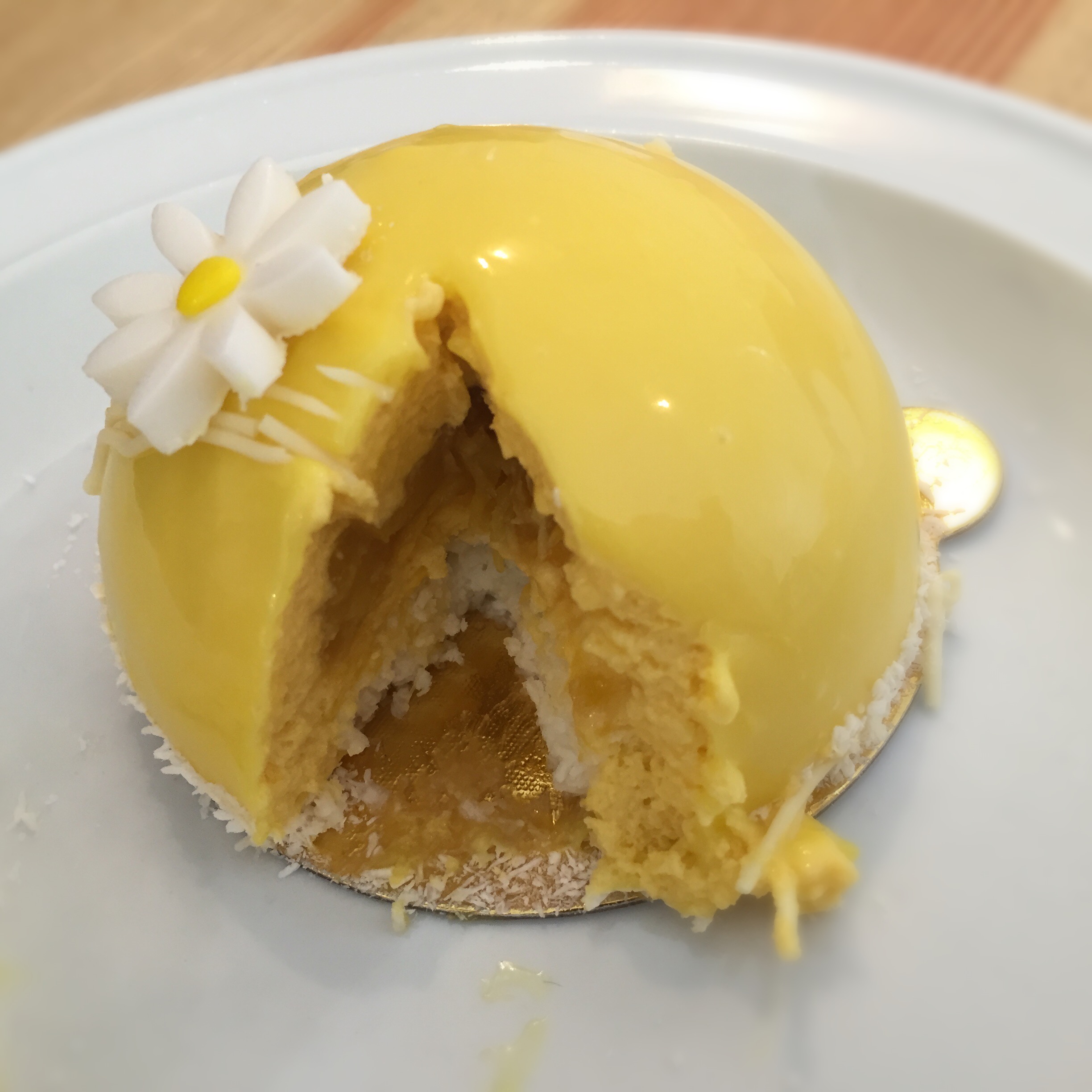 There are 4 layers altogether: Mango glaze, mango mousse, caramelized mango and coconut dacquoise (pronounced as “dah-kwahze” in French).