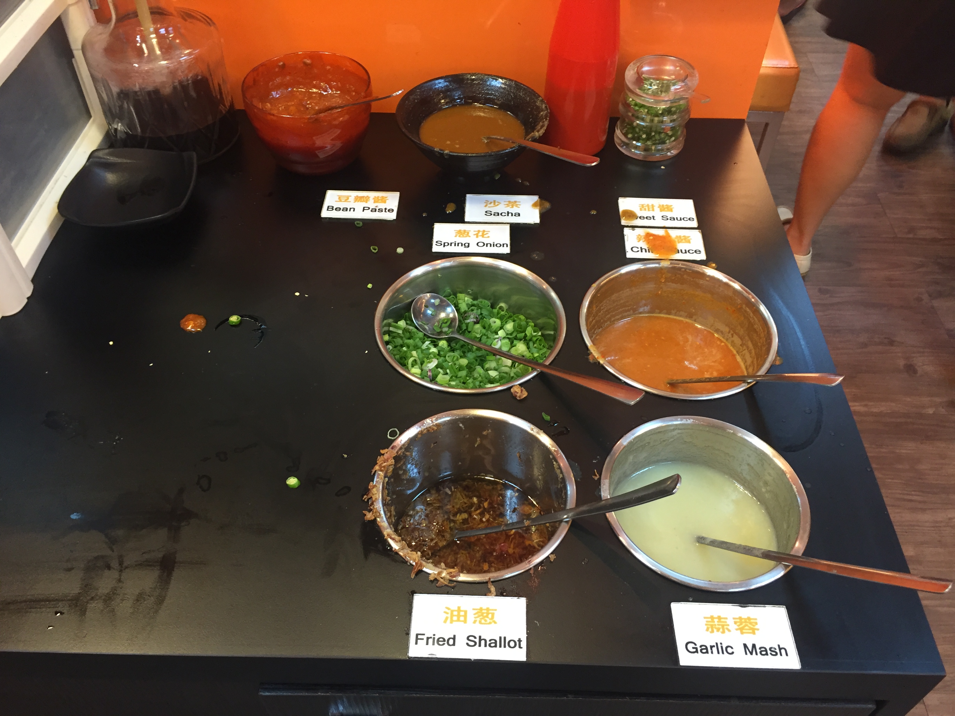 Certain things are on self-service basis .. getting utensils, condiment (spring onion, fried shallot) sauce (chilli sauce, garlic mash, bean paste, sacha) and refilling Chicken soup for the Two Pesos BBQ Pot.
