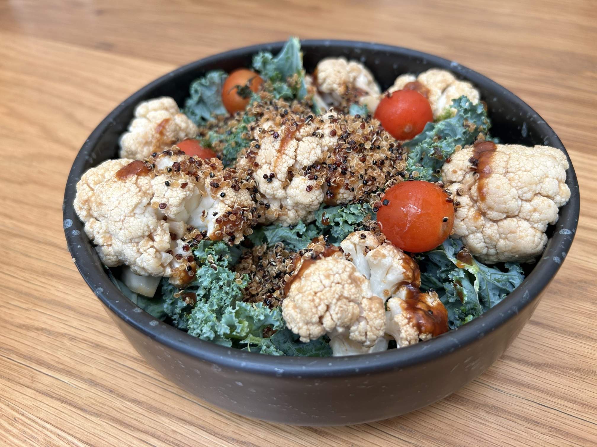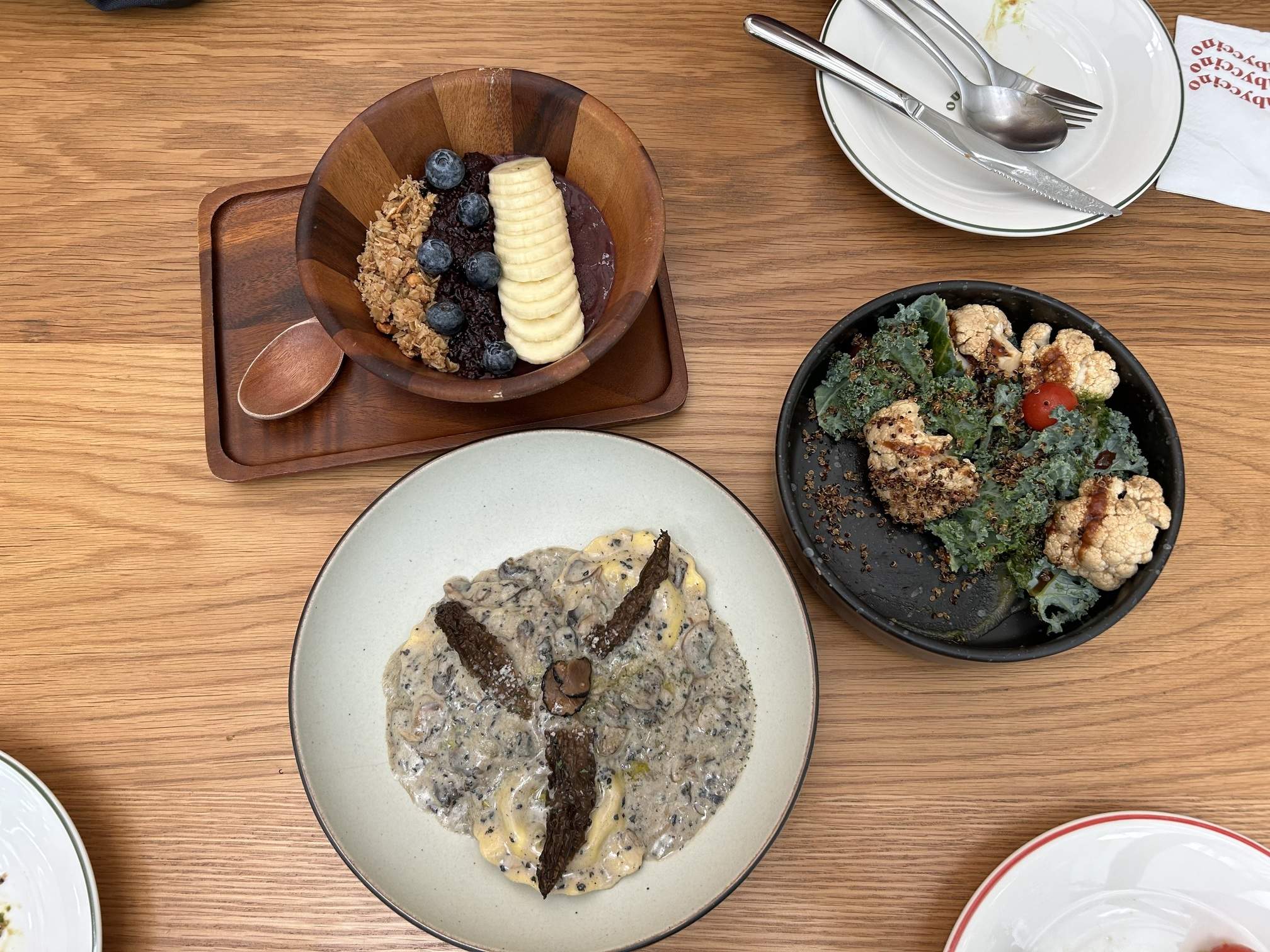 - Miso Glazed Cauliflower (350 baht): This dish was a revelation! It combines miso cauliflower, kale, and quinoa, served with a delicious pesto and parsley dressing. We loved it so much it has become an inspiration for replicating at home.