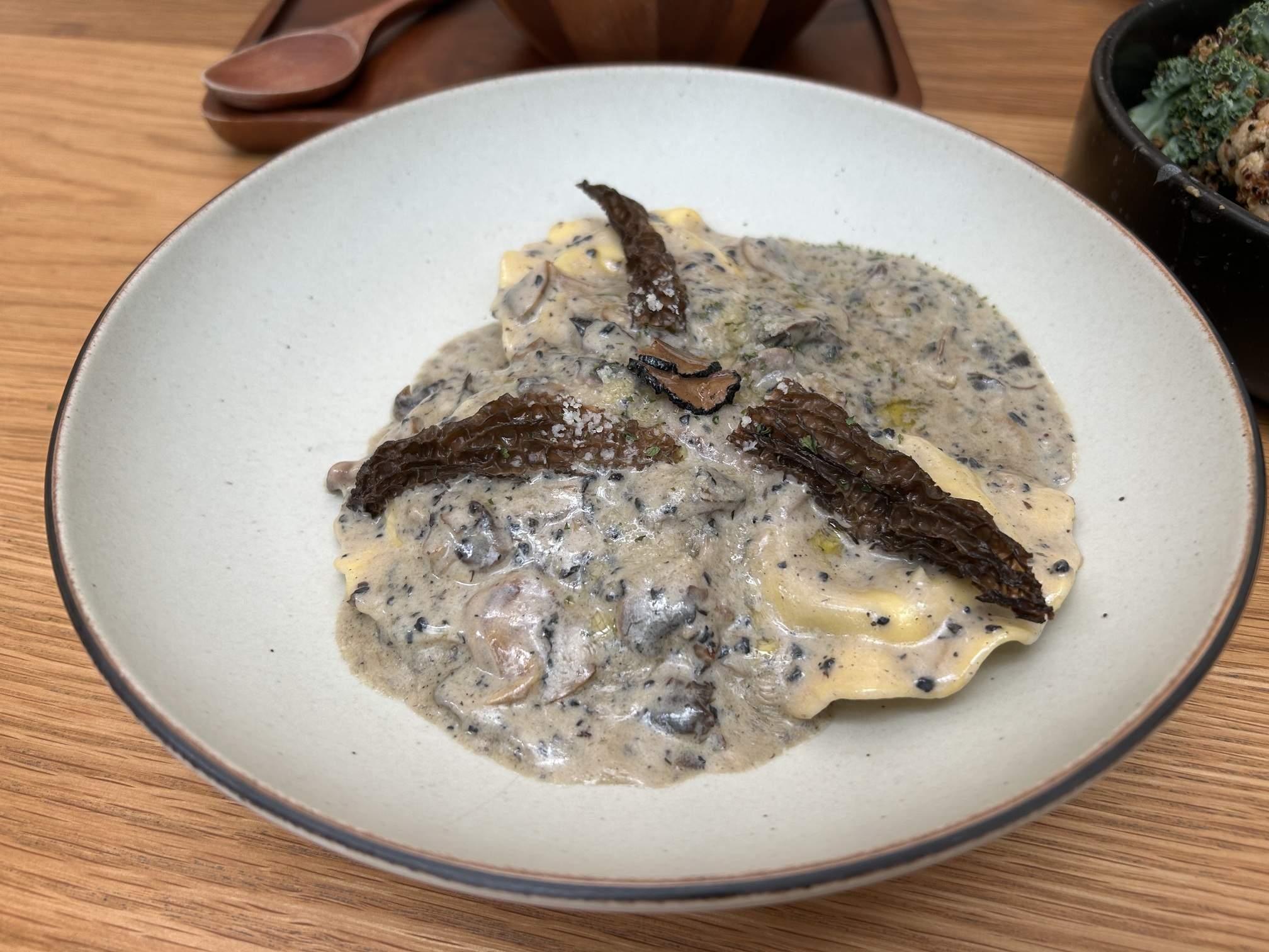 - Truffle Mushroom Ravioli (350 baht): This dish features mushroom-stuffed ravioli and morel mushrooms in a rich truffle cream sauce. My niece commented on the unusually large size of the three pieces of ravioli, proving that this traditionally small serving can still be substantial.