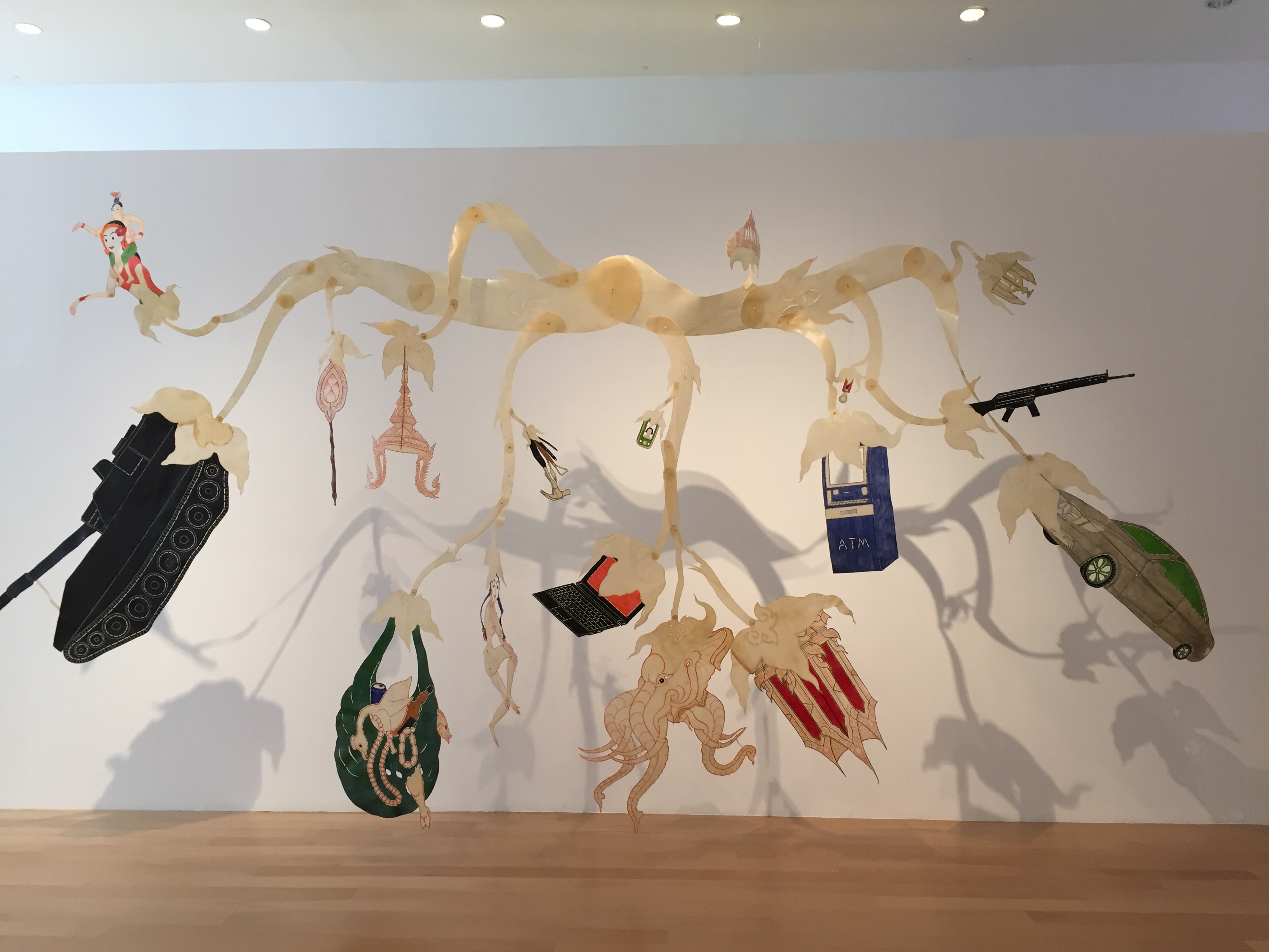 ‘Kanlapapruk’ by Chusak Srikwan, using leather engraving skills (which was used to make Thai shadow play puppets), he portrays many aspects of modern Thai life – superstition, Buddhism, politics, government, and rural and urban lifestyles.