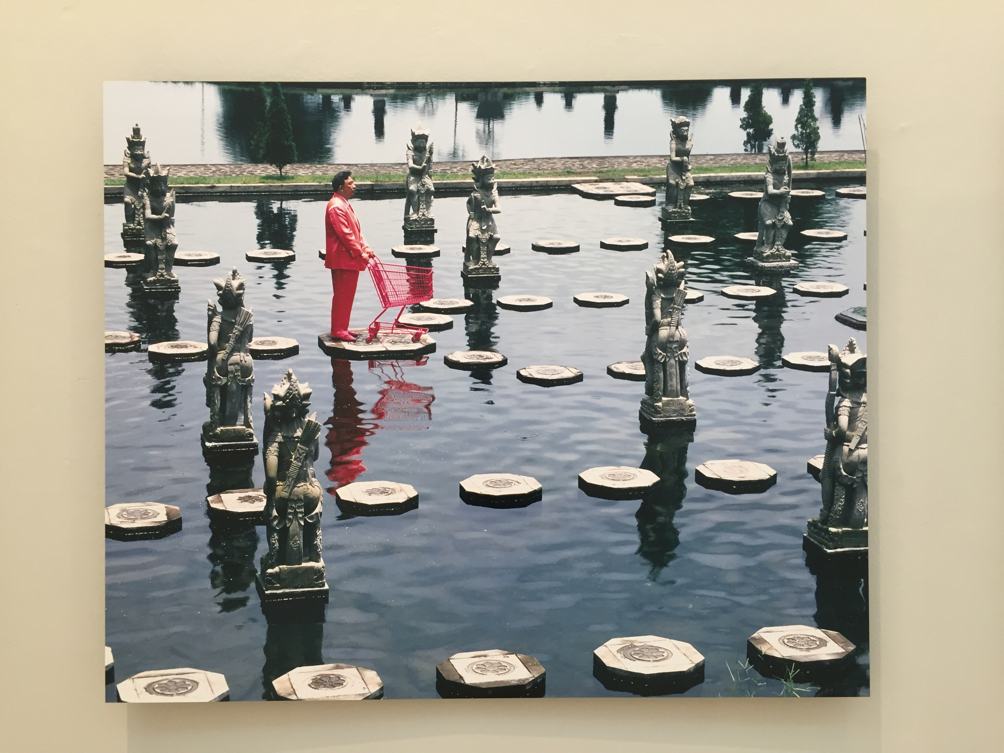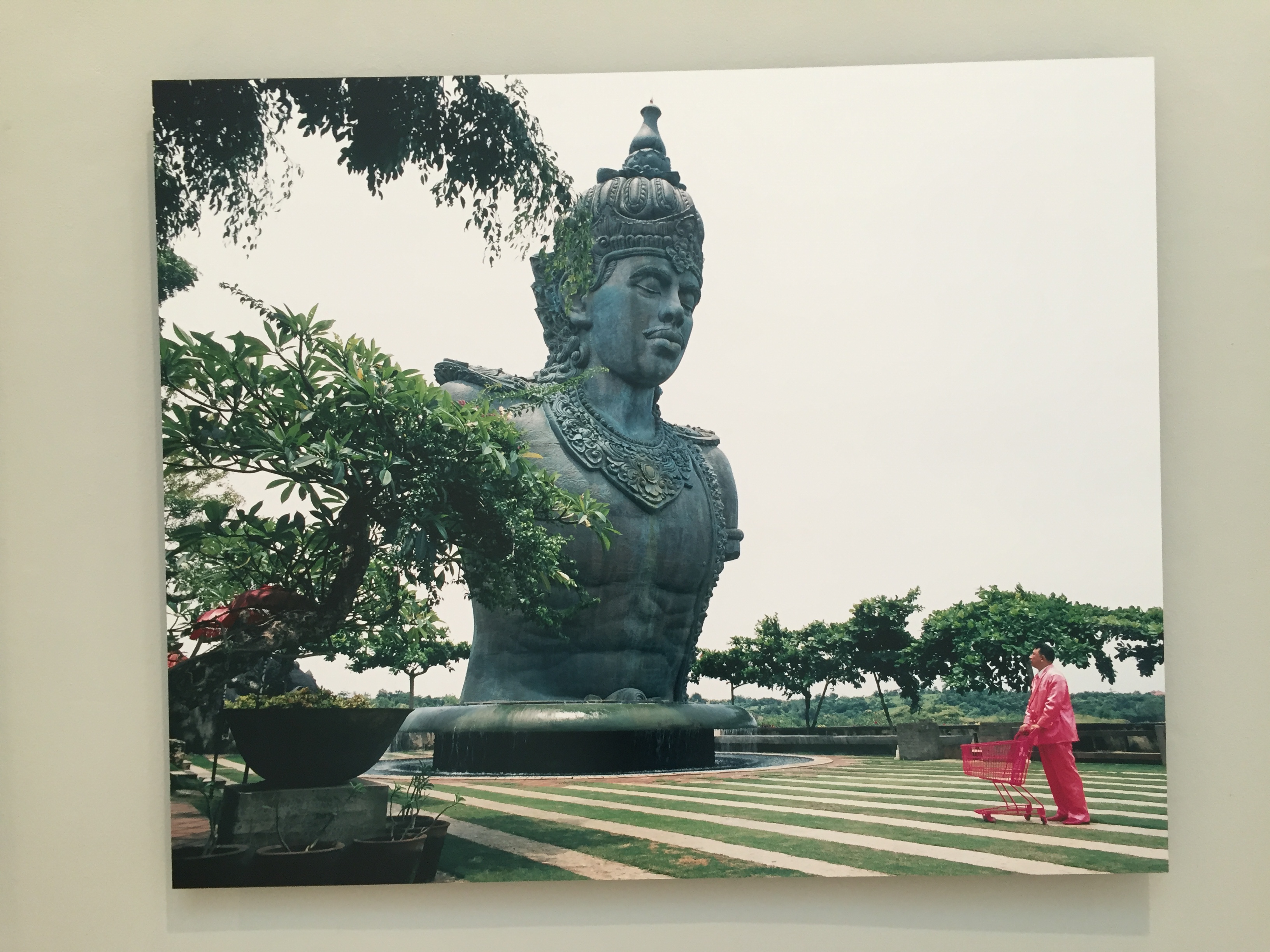 ‘Pink Man’ by Manit Sriwanichpoom, where performance artist, writer and poet, Sompong Thaweem pushes his shopping cart through Thailand’s consumerist society!