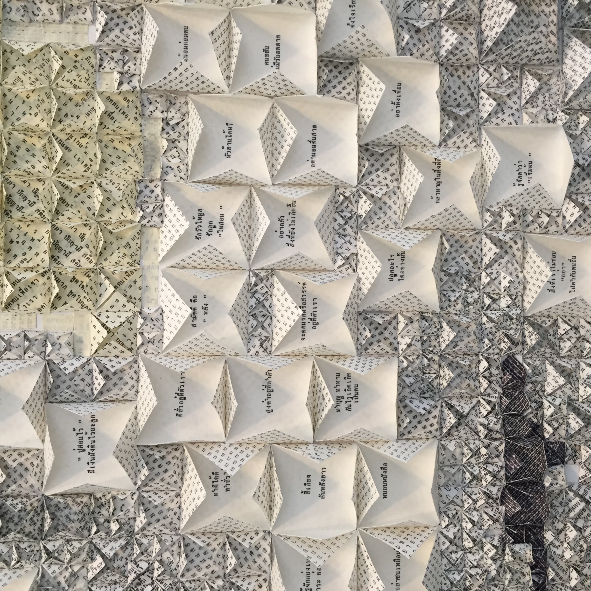 ‘Shredded Self-portraits’ by Kamoplan Chotvichai, the artist focusing mainly on prints, to weave a narrative of existence and non-existence. Repeatedly cutting up images of her own face, hands and body into thin strips, she works at eroding her ego into non-existence.