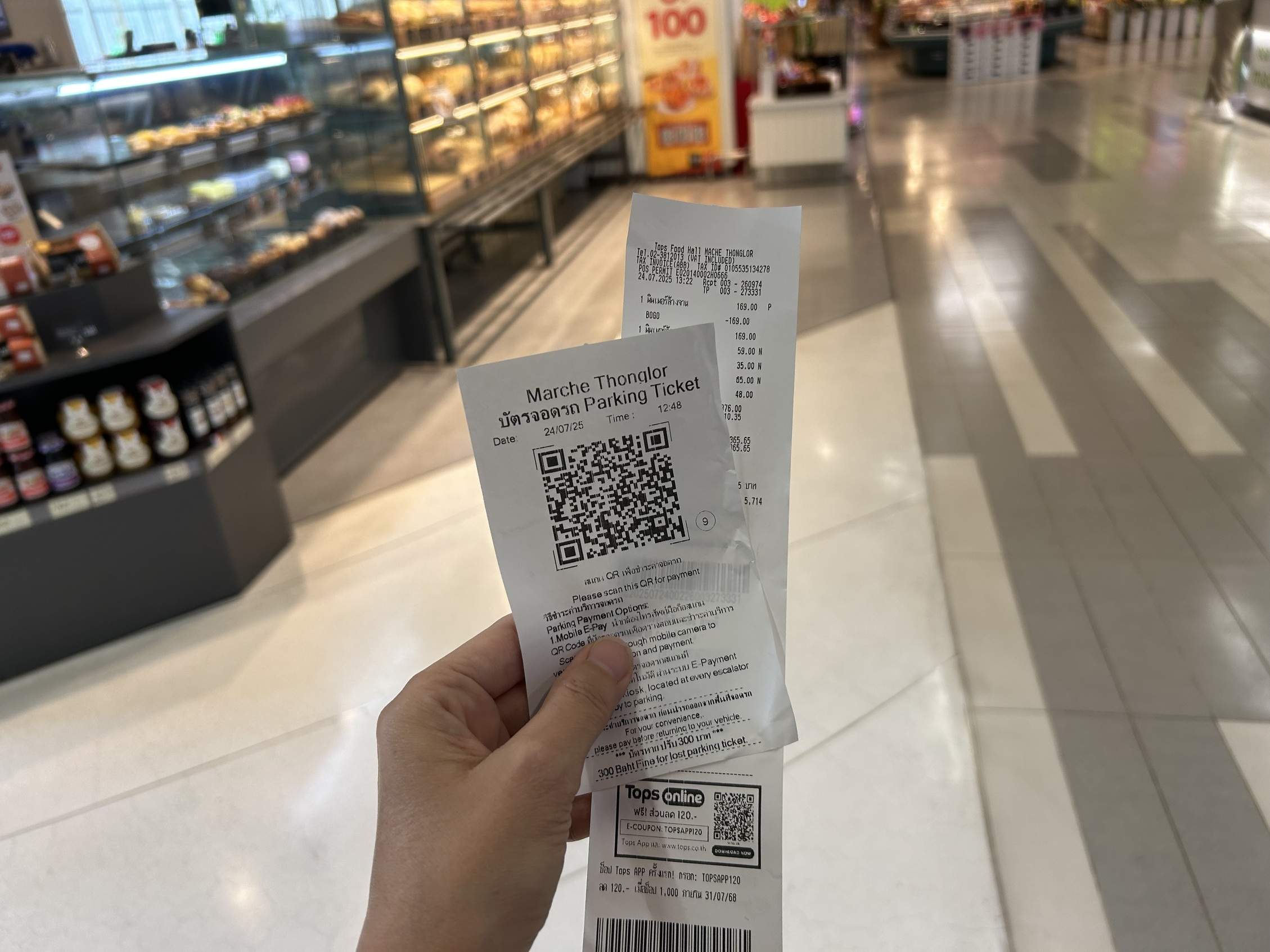 How it works: When you enter, simply wave your hand at the contactless scanner to get your parking ticket. Before you exit, you’ll need to validate your ticket at one of the designated machines or at the parking redemption counter if you have a qualifying purchase. In my recent visit, a single Tops Market receipt totaling over 200 baht easily granted me free parking for my 1.5-hour stay – a much better outcome! This clever parking fee waiver scheme is something my husband has long practiced, and I’ve finally caught on since I’ve started driving more often in Bangkok recently. It definitely makes a lot of sense and benefits customers who are patronizing the establishments.