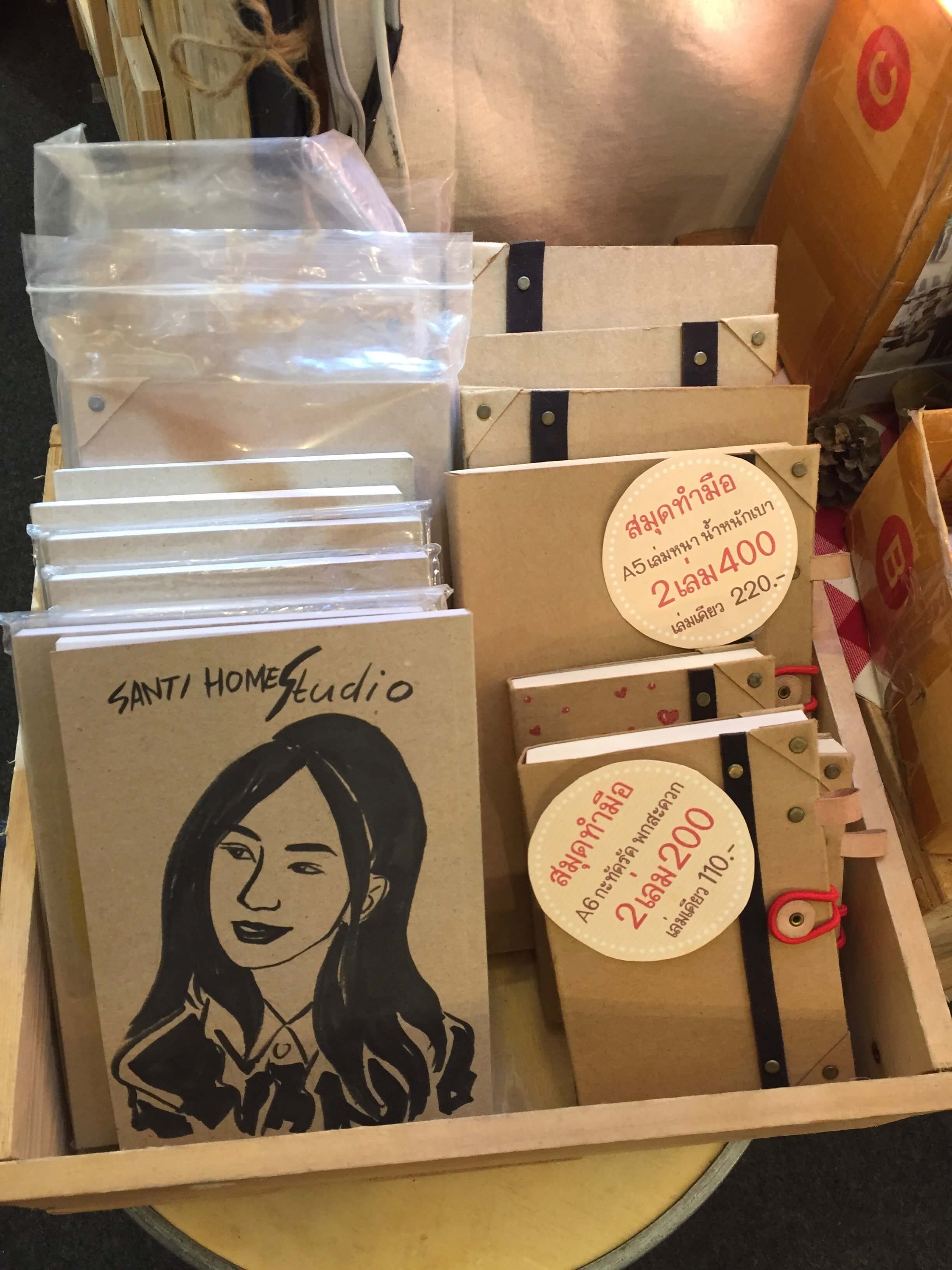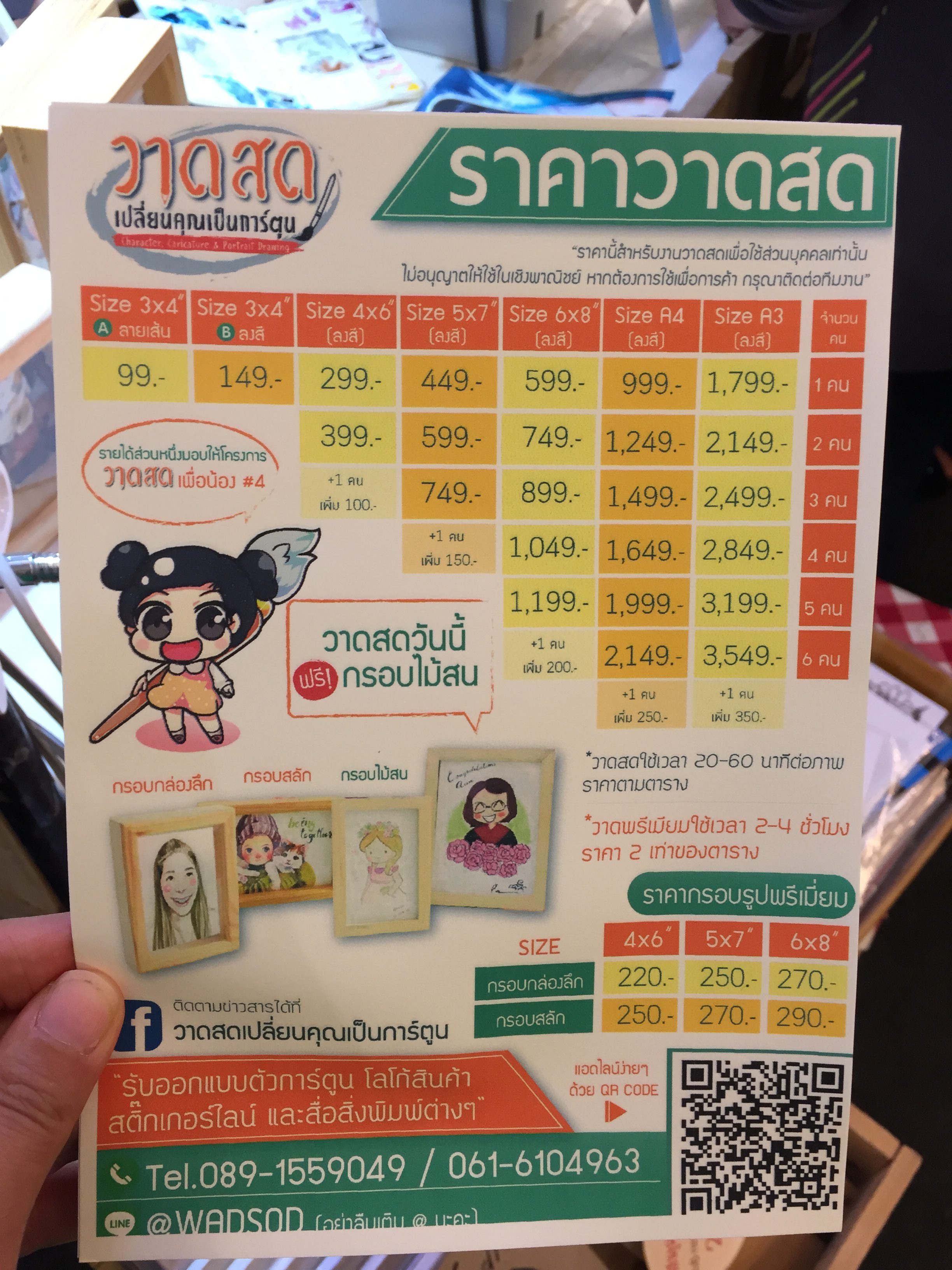 They also have different type of products – such as notebook (100-200 baht each), etc. Caricature drawing fee applies on top of the product price. Example: 4’x6′ notebook costs 200 baht each + 399 baht (2 persons) = 599 baht per notebook.
