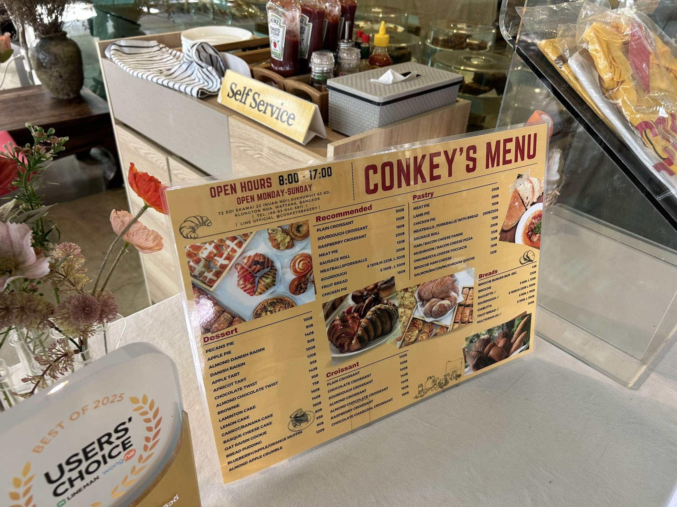 My recent errands in Ekkamai had become a routine, and I decided to inject some joy into the daily grind by exploring nearby eateries on foot. That’s how a serendipitous Google Maps search led me to Conkey’s Bakery. The 1.6km walk, winding around the Ekkamai alleys and down to Sukhumvit 71 Road, felt longer than expected – but absolutely worth it. Not only do they carry sourdough goodies, but also a full range of bread, pastries, desserts, croissants, and even meatballs and sourdough croissants on the menu.