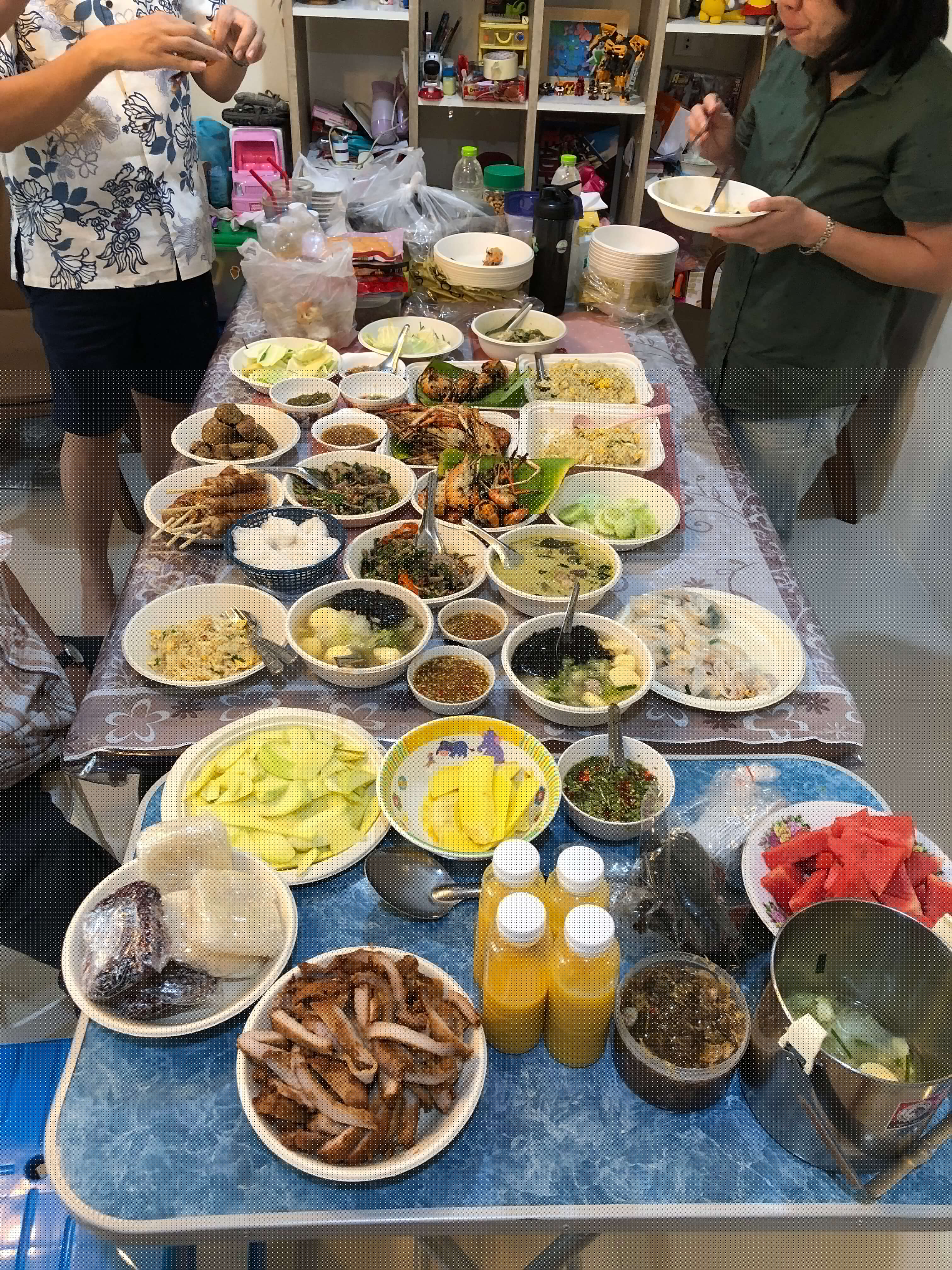 A “pot luck” meal contributed by host and guests filled our tummy. There was also a “water blessing” ceremony, pouring scented water over the palms of the elders in the family and receiving blessing in return. We also gave them a flower garland each.