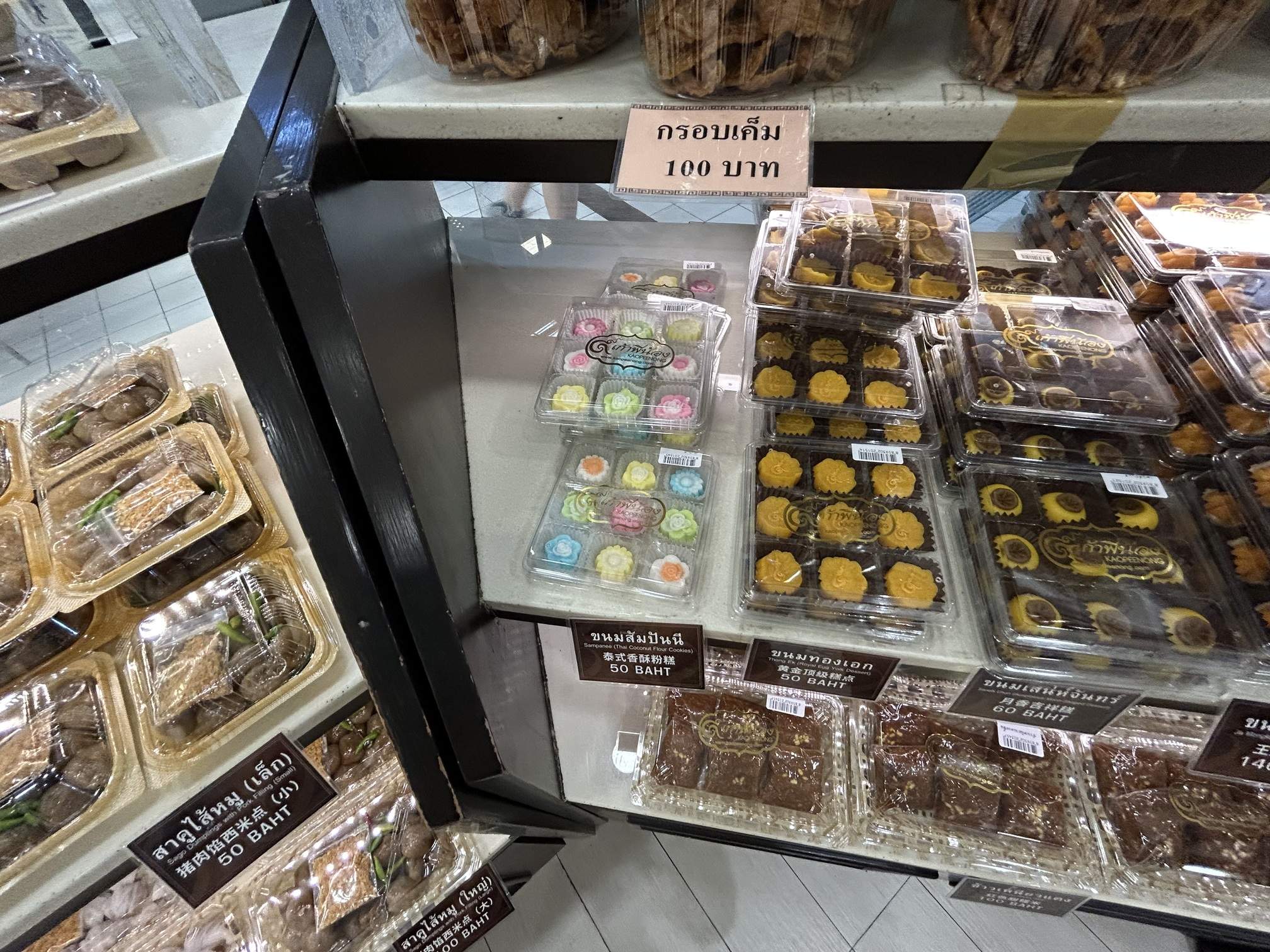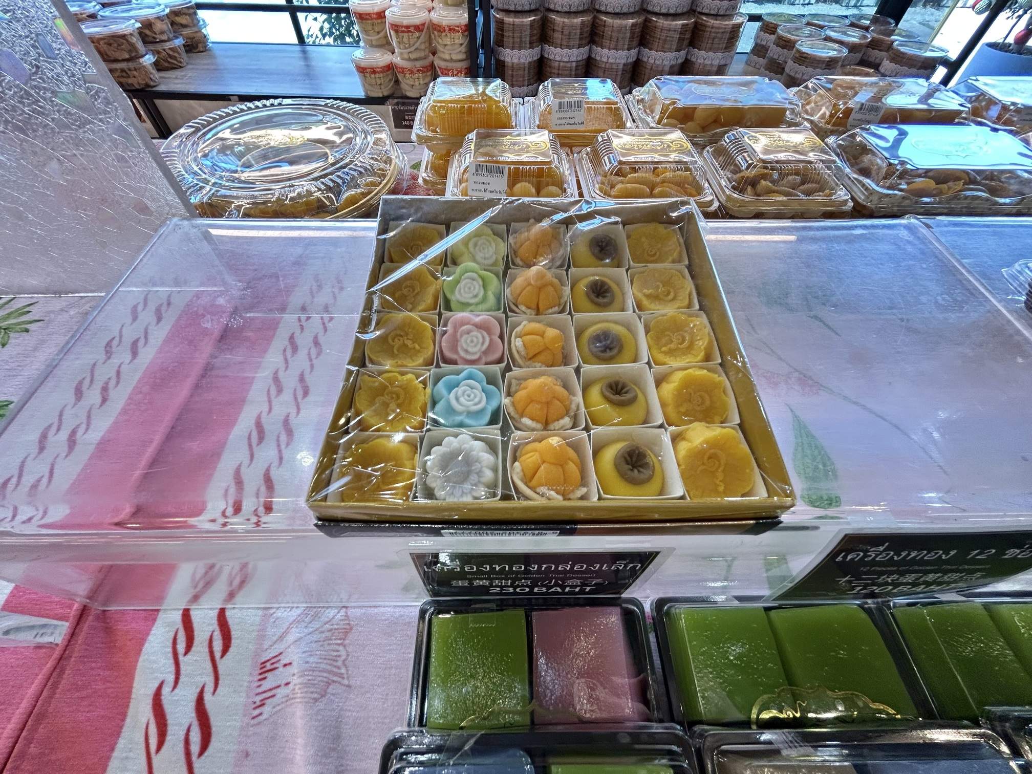 Another great option is the Thong Ek (ทองเอก) box (small size for 230 Baht). These “wheat flour dumplings with egg yolks” are traditional Thai treats made with coconut milk and sugar, often scented with candle smoke.