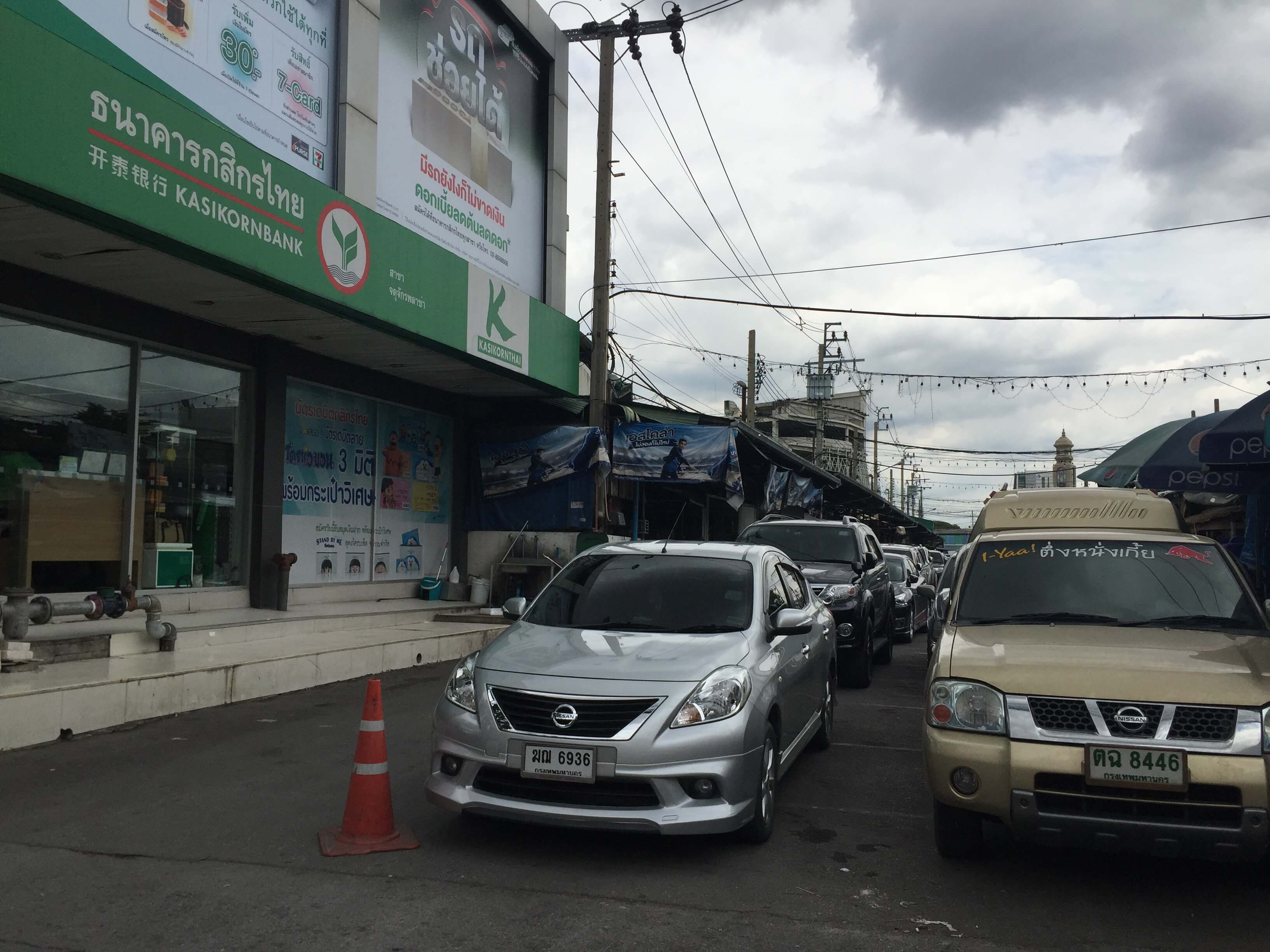 After you reach the end of the shoplots, turn right and walk straight. You will walk pass SCB Bank. Further up, you will see Kasikorn Bank , facing JJ Outlet. There will be cars parked next to Kasikorn Bank. You can walk in here, for easy access to Chatuchak market.